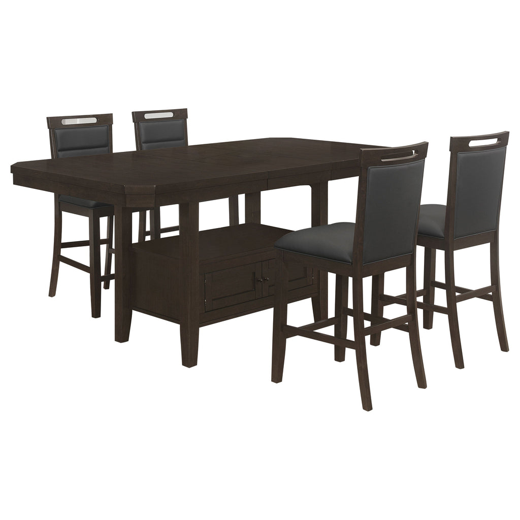 Dramatic design vibes are embellished with bonus storage space and a sensible configuration, perfect for turning your casual space into a haven for entertaining. Anchored by a counter-height dining table, this counter dining set offers extra height, always a plus for extended dining and casual coffee hours. Deep cappuccino finish wood construction emulates a modern farmhouse motif with a thick tabletop and a butterfly leaf to extend its length. A built-in lower cabinet makes space for serve ware on shelving behind four doors and an open shelf on top. Counter chairs feature matching cappuccino finish wood construction with cutout top details and black leatherette upholstery.