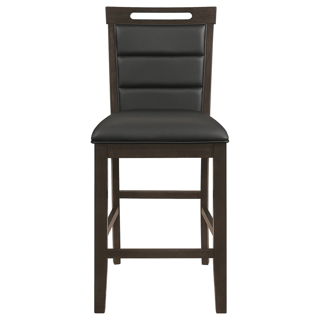 Counter chairs with matching cappuccino finish wood construction, cutout top details, and black leatherette upholstery