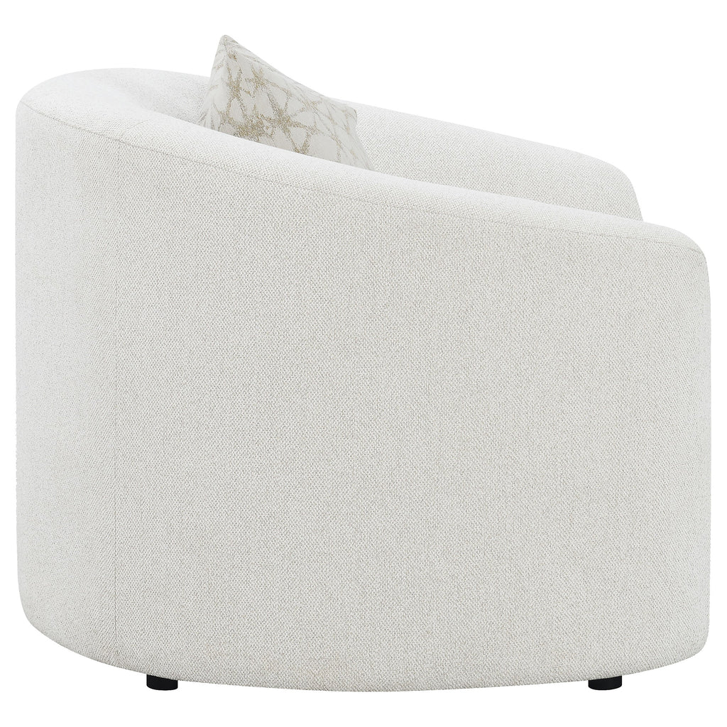 Elevate your contemporary living room reading nook with this elegant contemporary lounge chair, upholstered in a neutral latte finished boucle fabric throughout its contoured silhouette and curved sloped armrests. Accented by a single throw pillow, this sophisticated lounge chair presents a plush cushion and tailored backrest for a charming mid-century modern flair.