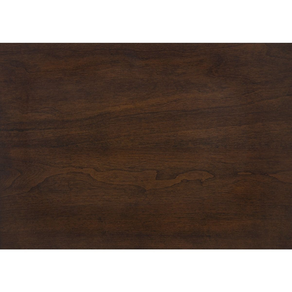 The subtle traditional design defines the profile of the Rexford Collection creates a timeless addition to your homes formal dining space. The tables classic trestle base supports the expanding tabletop, its extension leaf able to be neatly stored underneath. The wood-framed arm and side chairs feature nailhead trim, and gray fabric upholstery seats and backs. Providing ample storage space for your decorative tabletop accessories and tableware are the available buffet. The buffets drawer and door storage allow for unseen storage while providing open display on its top. Cherry veneer is highlighted with a finish solidifying the collections classic aesthetic.