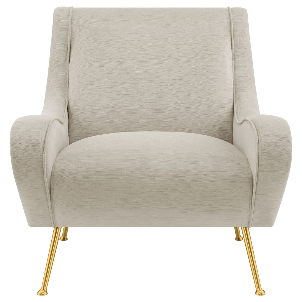 With a stylishly curvy silhouette, this accent chair offers an artisan approach to furnishings in your custom casual or semi-formal space. Embellish a living room or family room with a chic chair creating palette versatility and a romantic ambiance. Relax in style and beauty with a delicious design in seating, starting with plywood framing and soft textured velvet upholstery. Alluring flared silhouetting on its full-length armrests adds comfort in conjunction with an extra-wide build, as a comfy attached seat invites hours of pleasing leisure. Bring in a hint of retro style with slender, splayed gold metal legs and button caps that create a whimsical satellite effect.