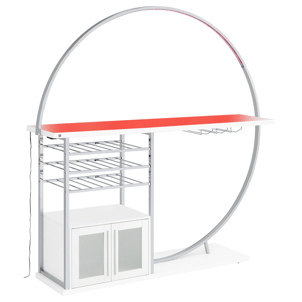 Transform your space into a beacon of style with this contemporary home bar that marries function with cutting-edge design. Bathed in the glow of LED lighting with a choice of eight vibrant colors, this piece becomes the centerpiece of any entertainer's haven. The sleek chrome electroplated metal frame supports a durable composite wood tabletop, perfect for hosting an array of glasses and spirits. Below, a two-door cabinet conceals essentials, while three tiers cradle up to 21 bottles of your finest wine. With a built-in stemware rack, this bar doesn't just store your collection, it showcases it, making every occasion a toast-worthy affair.