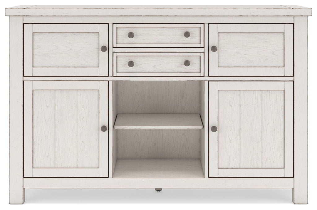 This dining server is sure to impress come mealtime. With its antiqued white finish and planked effect cabinet doors, farmhouse-style storage has never been so fashionable. All that’s missing is you and your family.