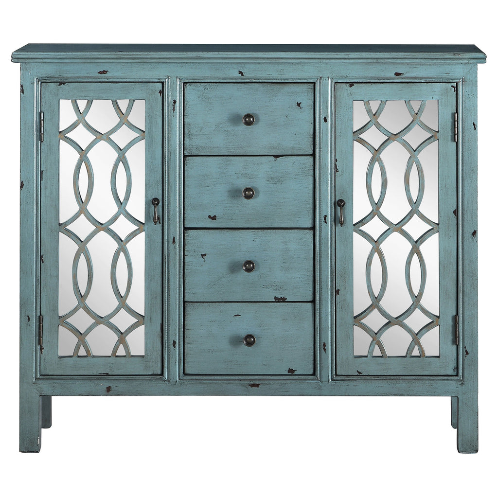This well-crafted wooden cabinet adds a splash of color and classic charm to any space. Finished in a distressed blue, it features four center drawers for organizing linens or silverware, while two side doors with mirrored insets and carved lattice detailing offer additional storage. The carved curves and vintage styling blend traditional design with contemporary flair, making it a standout accent in dining rooms, entryways, or living spaces.