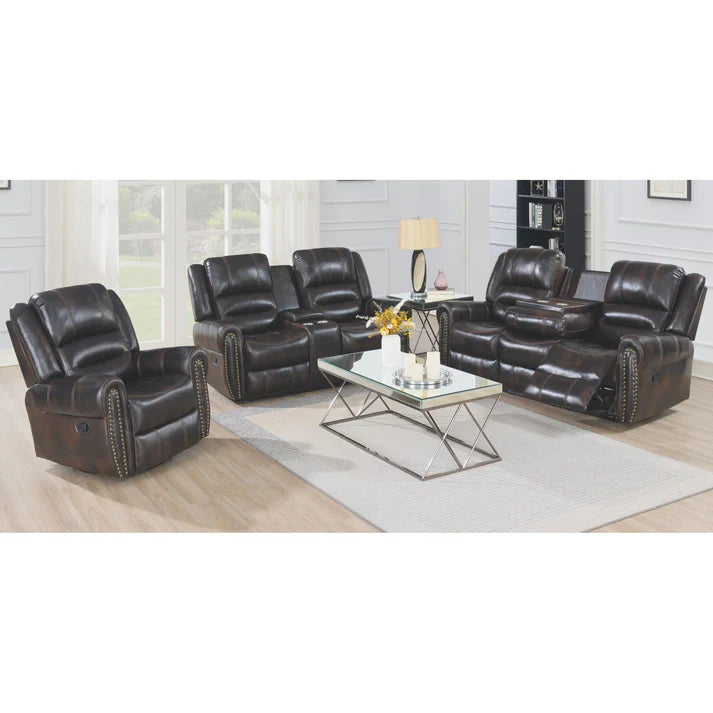 The Houston II collection is the ultimate choice for comfort-seekers and tech-loving homeowners. Finished in a rich Brown Leather Air, this set combines the luxury of leather with enhanced breathability. It is engineered for utility, featuring a Sofa with a Drop-Down Table (perfect for drinks and snacks), a Loveseat with a Storage Console, and a versatile Rocker/Swivel Recliner that offers 360-degree movement and a relaxing motion.