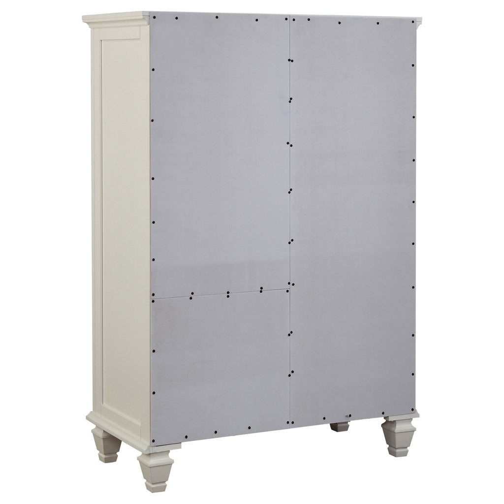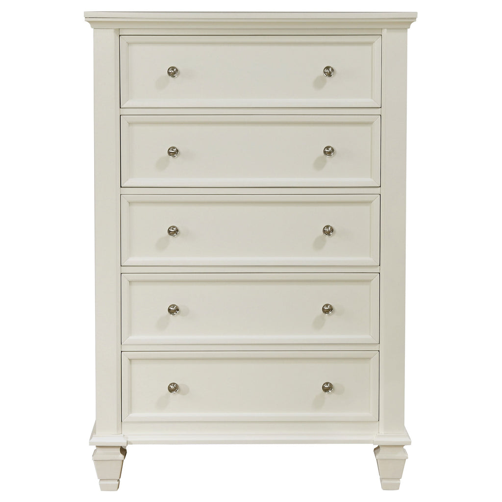 Add both storage and timeless elegance to your bedroom with this beautifully crafted chest of drawers. Featuring five spacious drawers, this chest offers plenty of room to organize your clothing, linens, and other essentials. The felt-lined top drawer provides added protection for delicate items, while the brushed nickel hardware adds a touch of modern sophistication. Constructed from solid hardwood and engineered wood, this chest is designed for durability and lasting appeal. Finished in a neutral color, it complements both traditional and transitional bedroom styles, bringing both beauty and functionality to your space.