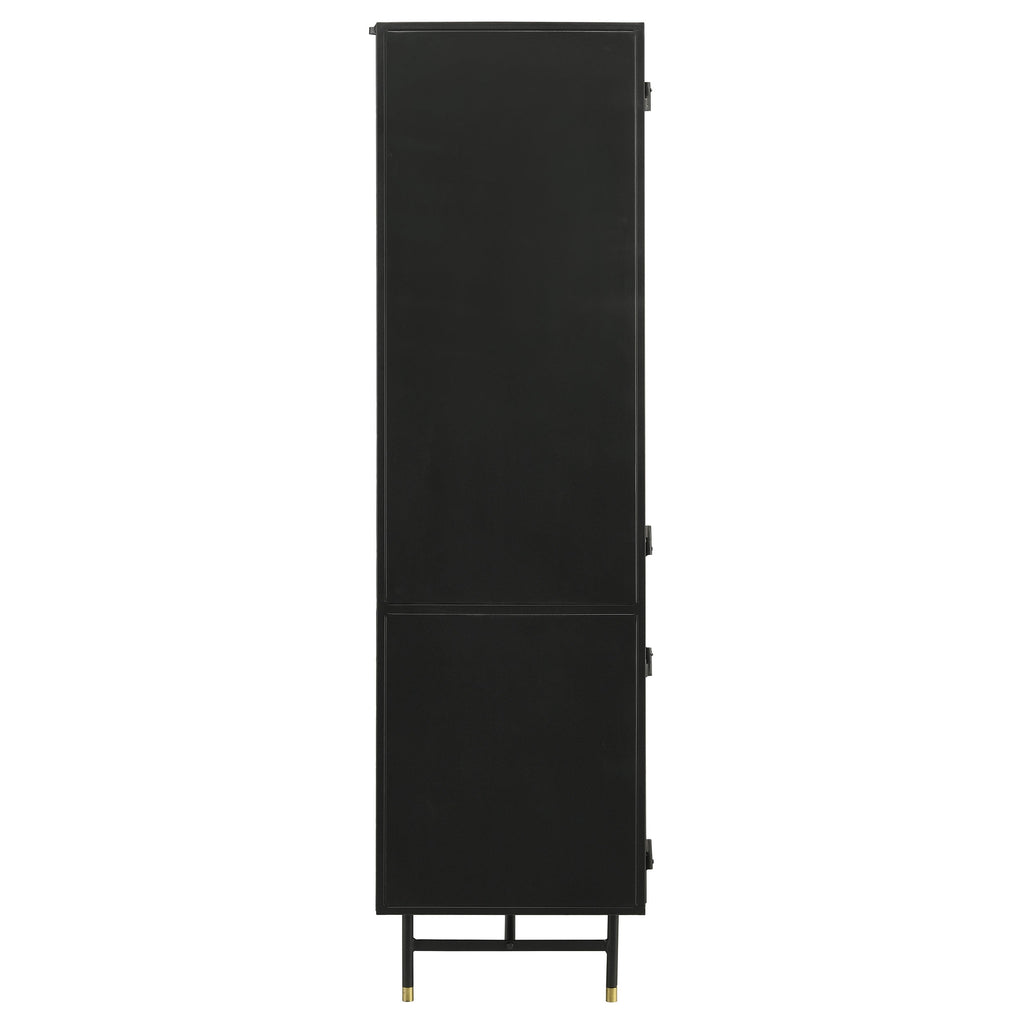This industrial style metal cabinet offers ample storage space and a bold look in a space. With its matte black finish and accents of antique brass finish hardware, the cabinet offers a subtle contrast while exhibiting style and grace. With its tall design and rectangular shape, this cabinet takes up minimal floor space, bringing the eye up to showcase decor and collections behind tempered glass doors. Adjustable shelves and interior shelves behind the bottom cabinet keep everything from barware to throws and linens. Resting on a trestle base with legs capped in a matching antique brass finish hardware, this elegant and stately accent cabinet offers a touch of glam too.