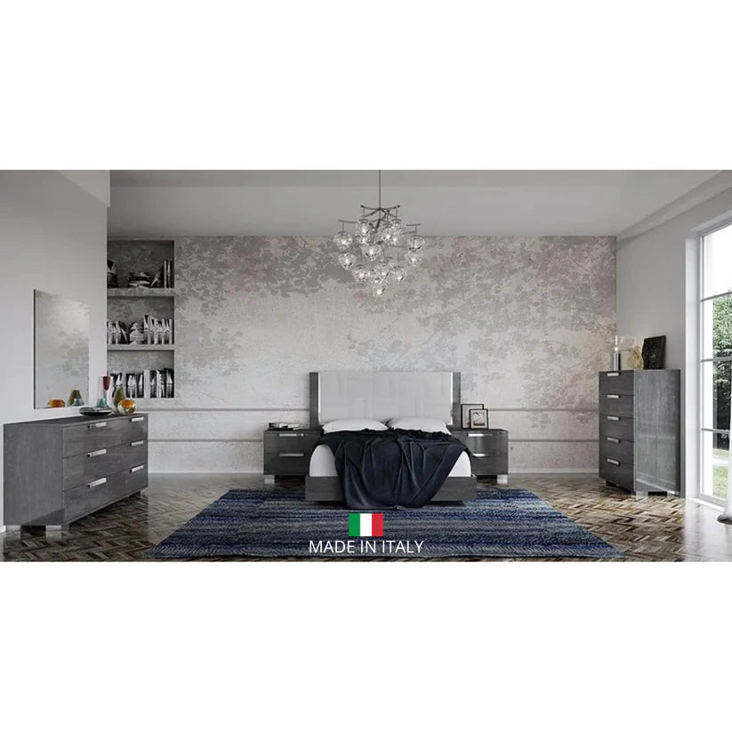 The Sarah Geo Ice Collection is the pinnacle of European sophistication. Crafted from premium stained Birch and coated in a multi-layered High-Gloss Grey Lacquer, this suite offers a depth of finish that is rare in contemporary furniture. The natural wood grain under the lacquer, paired with striking metallic accents, creates a "cold-luxury" aesthetic. Manufactured in Italy to the highest international standards, the Sarah Geo Ice is designed for those who want a bedroom that feels like a modern sanctuary of premium craftsmanship.