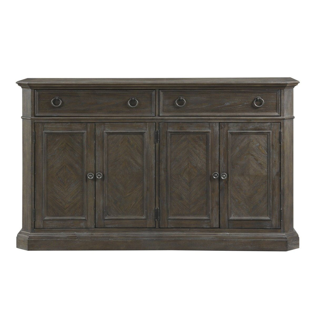 With a style that fits the transitional aesthetic of your home, the Sarasota Collection is sure to become a perfect platform for your mealtime activities. The servers door fronts catch your eye with their quadrant v-matched veneer pattern while the ash veneer is highlighted with a driftwood brown finish for a wonderfully weathered aesthetic. The server features behind door and drawer storage allowing for ample space in which to place your tabletop accessories.