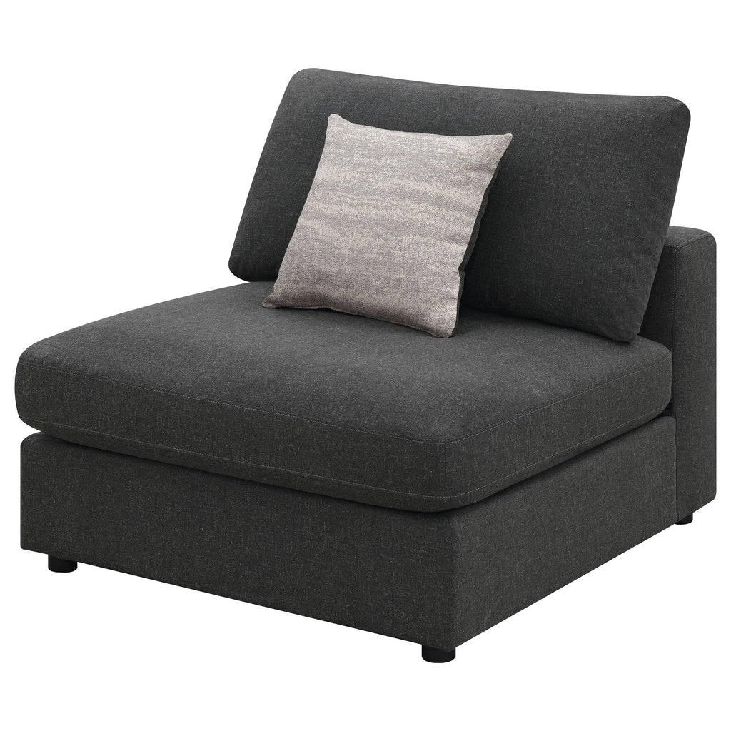 Create your own modular home setup with this plush, armless chair. It entices you to sink into its deep, comfortable cushions. The chair can function alone, as well as part of a larger sectional sofa. The simple lines of the piece add up to a comfy, easy-to-use element in any decor. Linen adds a natural textural accent.