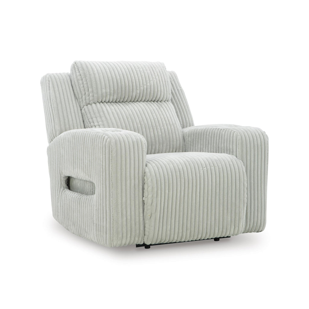 Trend-right style, meet irresistible modern function. Your living room gets a cozy-cool upgrade with this power recliner. Curl up in its ultra-chic corded upholstery and recline with one-touch controls. Is it movie night or game time? With ambient LED lighting, this recliner transforms from a serene relaxation spot to an entertainment hub. USB charging, cup holders and storage cutouts make lounging all the more convenient.