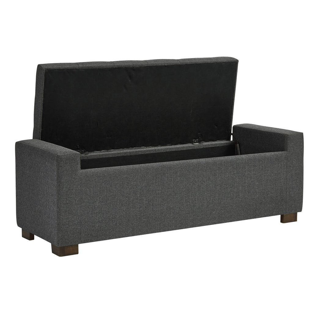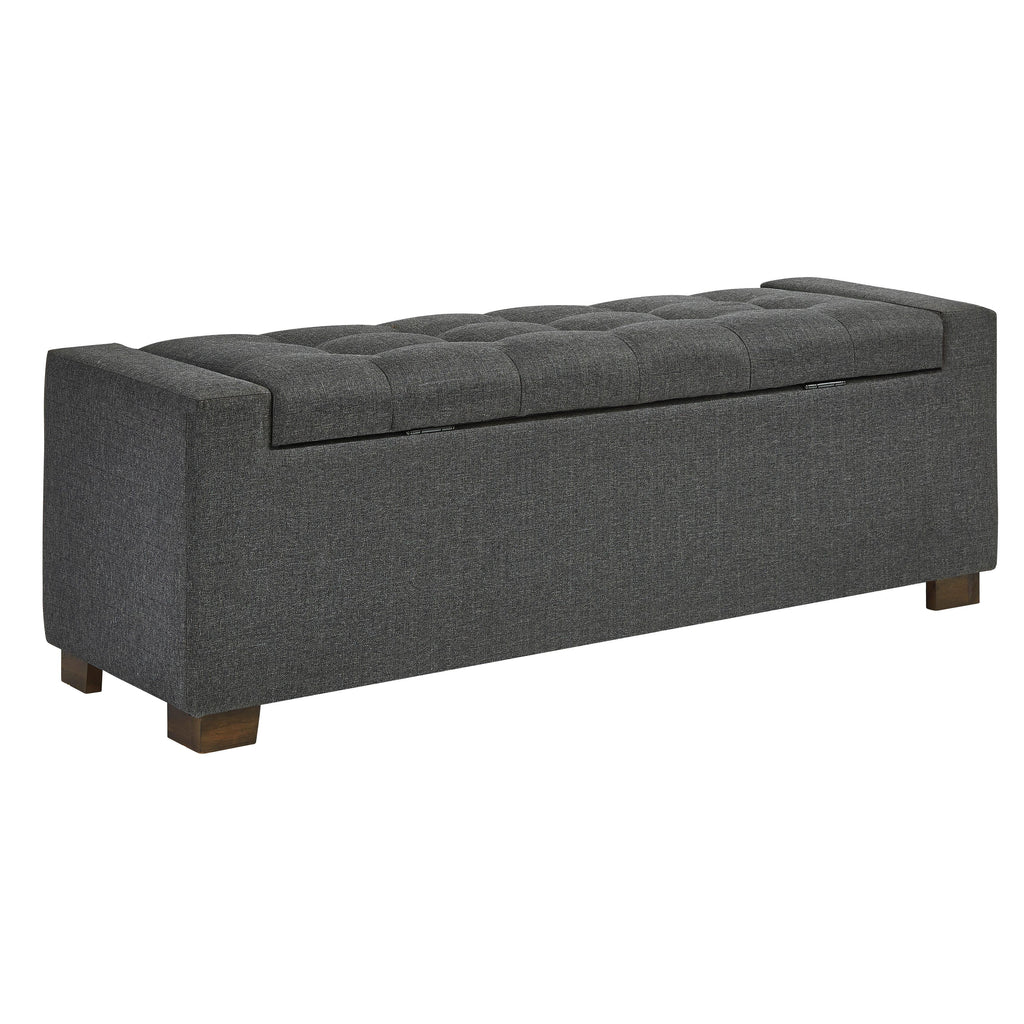 Whether gracing a front entry or living room, or placed at the foot of the bed, this upholstered storage bench is loaded with flair. Tufted cushioned seat with hinge reveals an ample storage compartment for this, that and the other. Gorgeous gray fabric is the epitome of neutral sophistication.