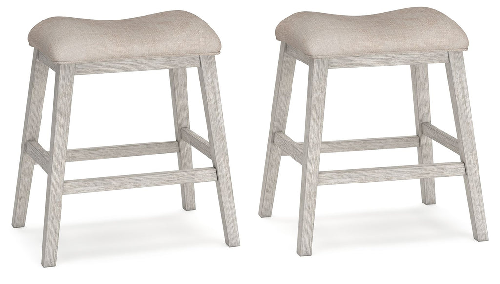 This upholstered stool invites you to raise the bar on small space living. An inspired choice for coastal chic or modern farmhouse settings, this comfortably cushioned stool sports a grayish white finish with rub-through effect for timeworn appeal.