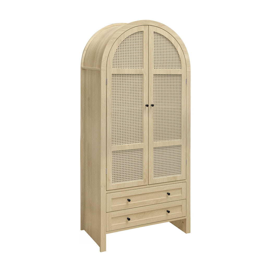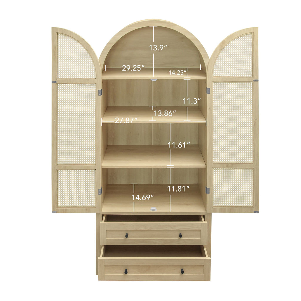 Tall Arched Kitchen Pantry, Arched Storage Display Cabinet With 2 Drawers & Adjustable Shelves, Rattan Door Versatile Storage Cabinet For Kitchen, Dining Room, Living Room - Natural