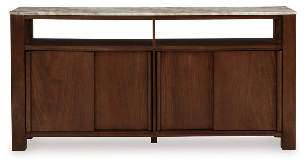 High style and functionality? Check and check. This accent cabinet's taupe, white and gray marble top and contrasting dark brown finish bring the wow factor. Sliding doors open to reveal shelves that are perfect for hiding everyday clutter. Whether you use it for storage or as a TV stand, this showpiece creates contemporary elegance with ease.