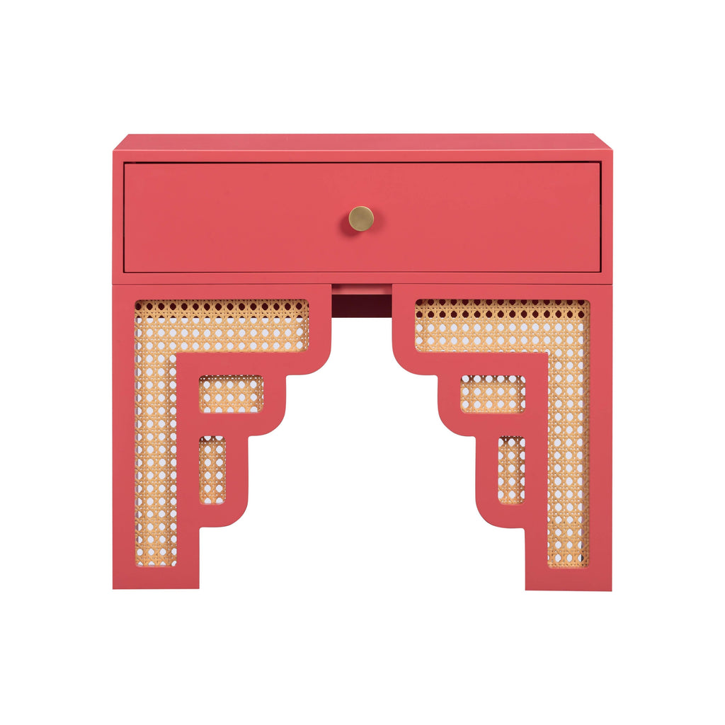 Inspired by the Art Moderne style, the Suzie Nightstand alludes to Palm Springs' art-deco design through its bold colors and... Inspired by the Art Moderne style, the Suzie Nightstand alludes to Palm Springs' art-deco design through its bold colors and curvaceous form. This wooden nightstand features a soft close drawer for practicality; while its rounded edges and woven rattan details add a playful twist. The Suzie will cement itself as the perfect balance between contemporary living with a touch of glamour in your space!Handmade by skilled craftsmenWoven rattan accentsSoft close drawerDrawer dimensions: 22.5"W x 9.7"D x 3.2"HDimensions: 26"W x 15"D x 23"H View more