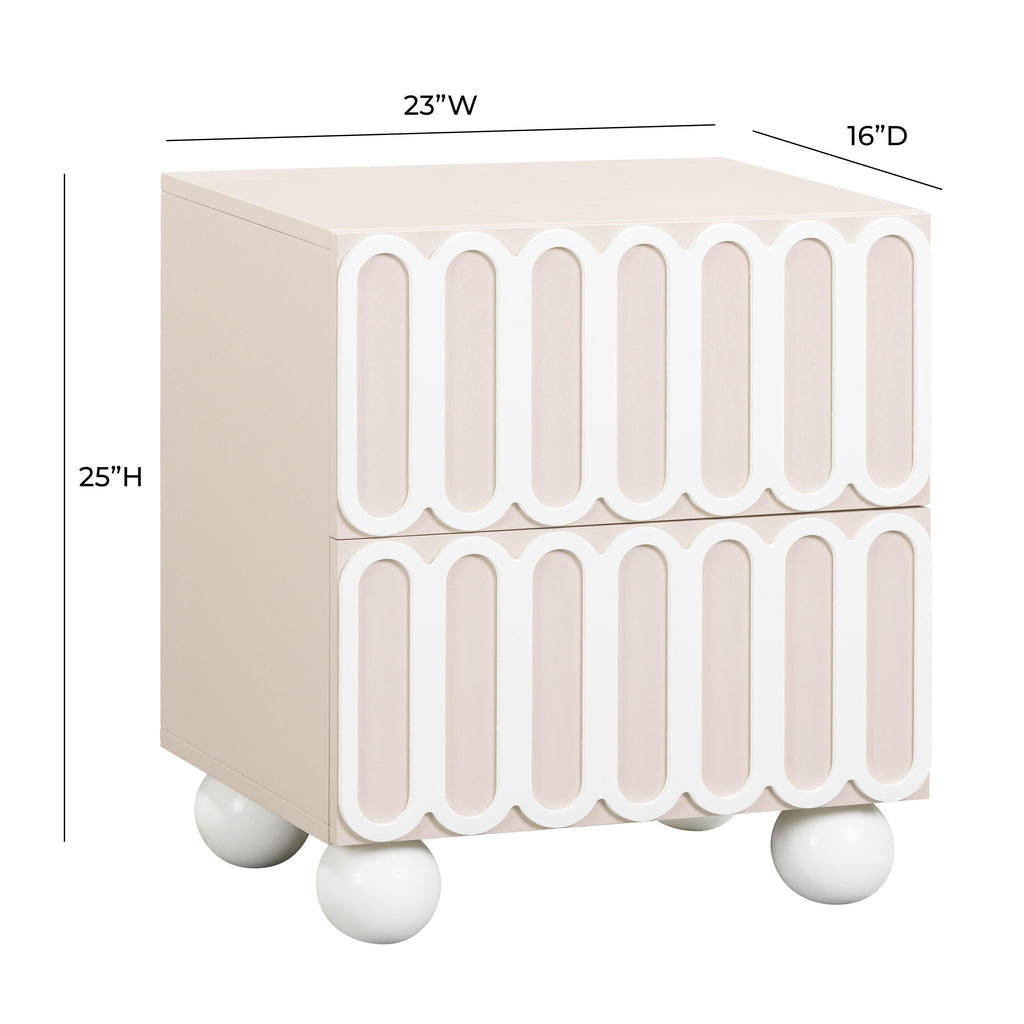 Say goodbye to a boring bedtime routine with the Tori Motif Nightstand, available in dreamy mauve or blue and sophisticated taupe, each featuring a statement-making facade that truly pops. Its solid wood, spherical legs infuse a sculptural Hollywood buzz, while the medium sheen on the surfaces delivers just the right amount of drama without fussy maintenance. Plus, the nightstand's drawers glide smoothly on soft-close rails, ensuring you keep the morning peace, not waking your partner as you start your day.