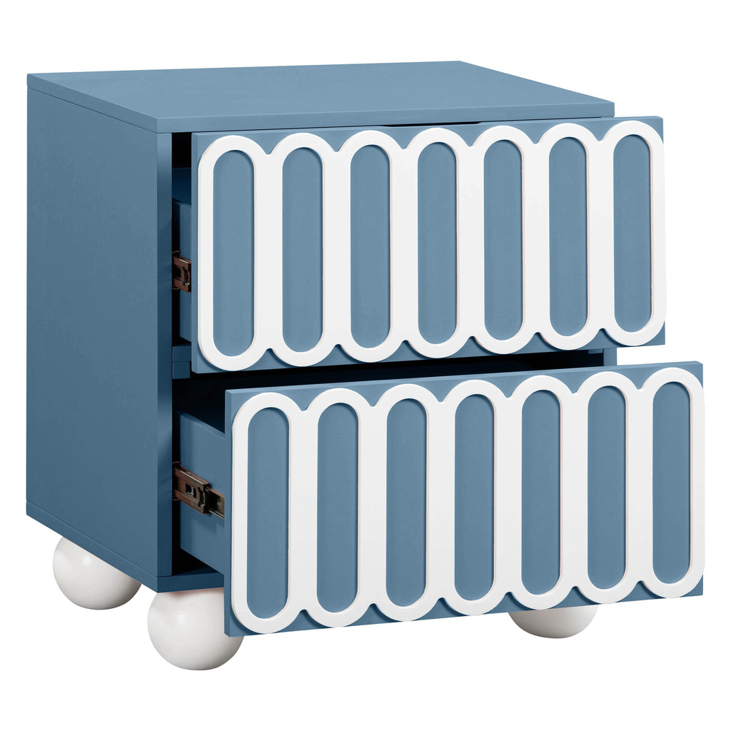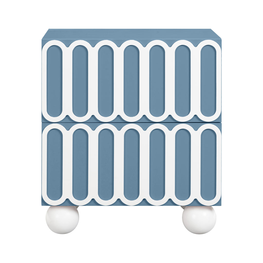 Say goodbye to a boring bedtime routine with the Tori Motif Nightstand, available in dreamy mauve or blue and sophisticated taupe, each featuring a statement-making facade that truly pops. Its solid wood, spherical legs infuse a sculptural Hollywood buzz, while the medium sheen on the surfaces delivers just the right amount of drama without fussy maintenance. Plus, the nightstand's drawers glide smoothly on soft-close rails, ensuring you keep the morning peace, not waking your partner as you start your day.