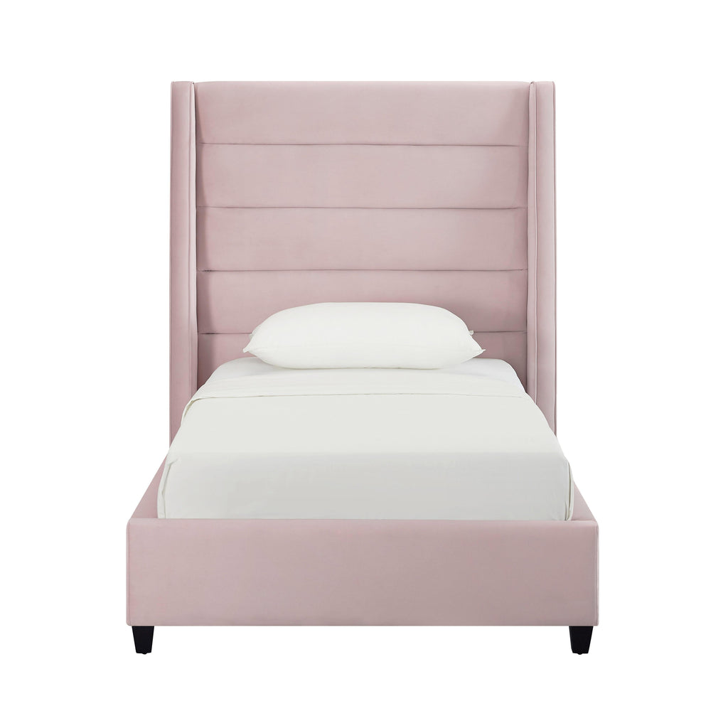Inspired by modern design, its sharp angles and channel tufted design make the Koah bed a true statement piece. Its... Inspired by modern design, its sharp angles and channel tufted design make the Koah bed a true statement piece. Its solid wood frame comes upholstered in several soft velvet color options. Available in King, Queen and Twin.Kiln dried pine frameAvailable in Twin, Queen and KingNo box spring required and slats are includedFabric swatch availableDimensions: 52"W x 82"D x 57"H View more