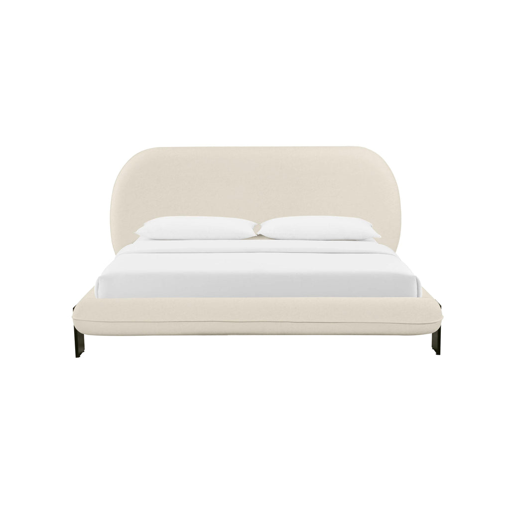 Introducing the Ophelia Cream Faux Wool Bed, a refreshingly modern rendition of a classic mid-century silhouette that makes a bold statement in any bedroom. Supported by unique straddling solid wood legs, the curvaceous and rounded frame is upholstered in a soft faux wool blend, providing the visual texture of wool without the scratchy fibers. The oversized, thick, and rounded headboard features super trendy oversized piping, and for an added touch of style, it comes with two matching bolster pillows, creating a chic and inviting focal point for your sleep sanctuary.