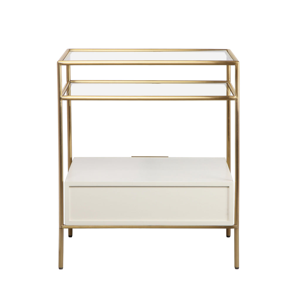 Add some understated drama to your bedroom with the Darla Cream Glass Nightstand, designed for effortless assembly without compromising on style. Its beautiful silhouette is accentuated by a brushed brass frame that glistens subtly beside any bed. With a glass top and shelf, along with a statement drawer pull, this nightstand seamlessly combines form and function to elevate your bedroom decor.