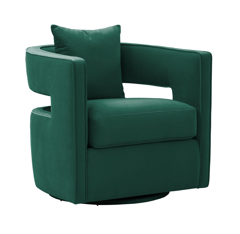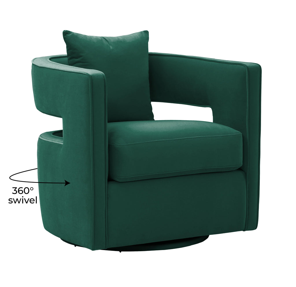 The minimalistic Kennedy swivel chair is versatile and stylish. A comfortable foam fill makes it as plush and inviting as... The minimalistic Kennedy swivel chair is versatile and stylish. A comfortable foam fill makes it as plush and inviting as it looks, while the solid wood frame and stainless steel legs set a sturdy foundation. This eye-catching chair will add a pop of style to any space. Sumptuous velvet available in multiple color options.Swivel chair with stainless steel baseKiln-dried birch frame with spring and webbing supportThrow pillow dimensions: 17.7"W x 17.7"HRemovable seat back cushionDimensions: 30"W x 29.5"D x 31.5"H View more