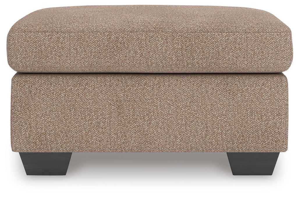 Transitional and right on trend. This ottoman's upholstery is a delightful change from the ordinary, with hints of soft brown giving the gray hue added depth. Whether you're hosting friends and family or relaxing solo, this ottoman invites homey, comfortable character into your space.
