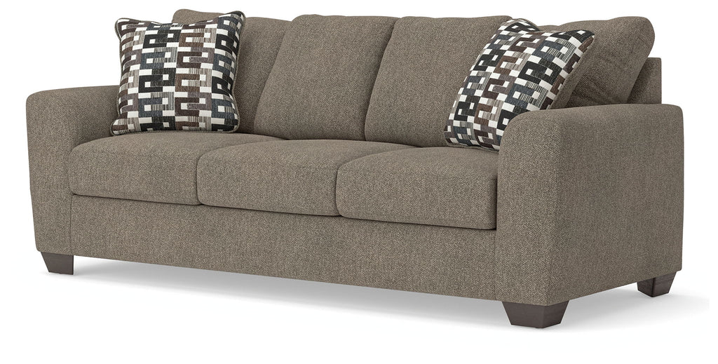 Transitional and right on trend. This queen sleeper sofa’s upholstery is a delightful change from the ordinary, with hints of soft brown giving the gray hue added depth. A built-in memory foam mattress easily pulls out to accommodate overnight visitors. It’s punctuated with chic accent pillows in an eye-catching, stylized stripe design. Whether you're hosting friends and family or relaxing solo, this sleeper sofa invites homey, comfortable character into your space.