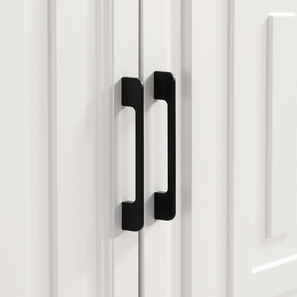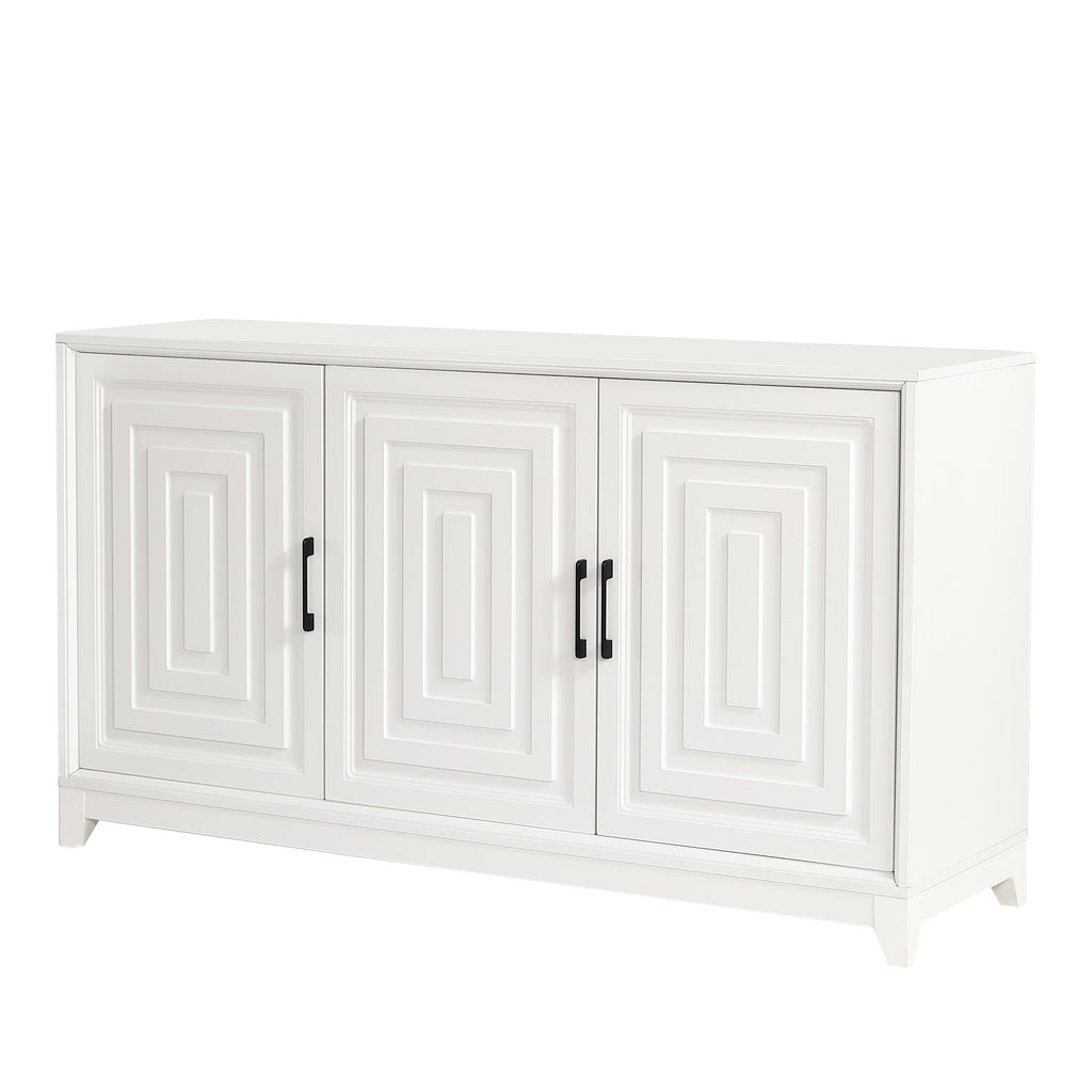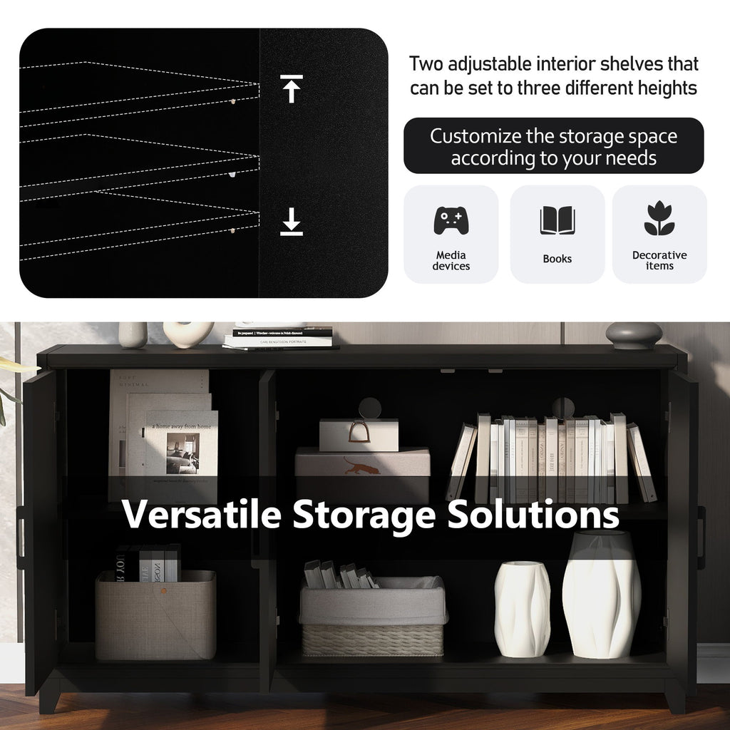 - Stylish and Sturdy: The cabinet boasts geometric doors with sleek metal handles for a functional and stylish touch. Supported by solid wood legs, it can hold a large TV and media equipment securely.