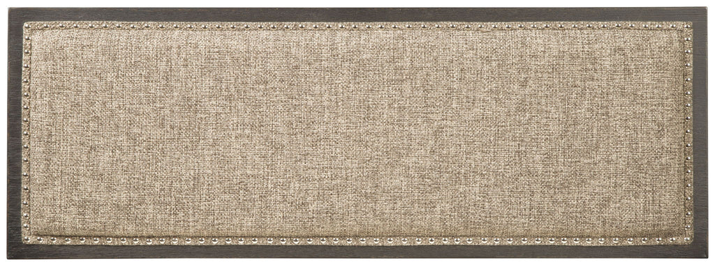 Invite your family into the heart of your home with this upholstered dining room bench. Its tapered legs provide a sturdy foundation, while the counter height design raises the bar on fine dining. With a textured black finish and heavy woven upholstery accented with silvertone nailhead trim, this is trend-right urban farmhouse style without all the fuss.