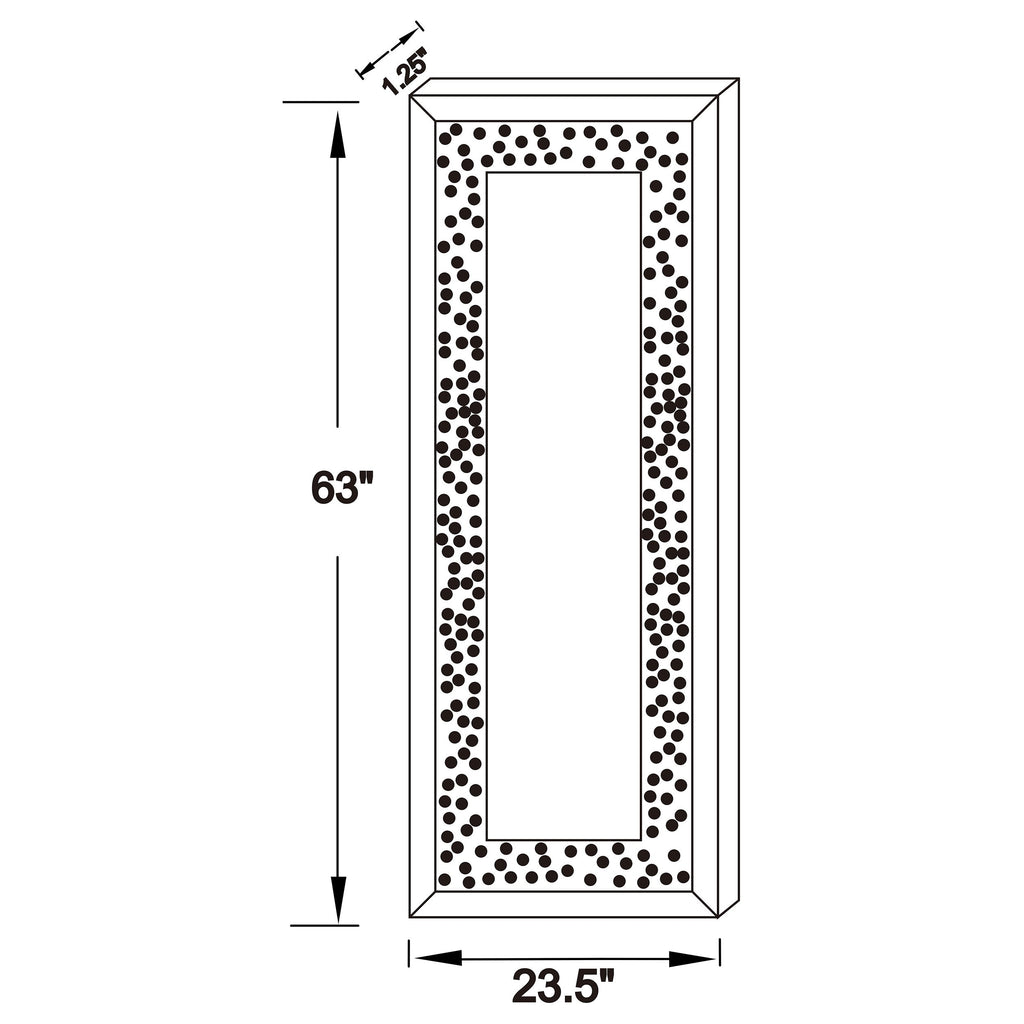 Soften your dressing room corner with this modern glam floor mirror. A slim mirror tile surrounds the outer edges of this tall mirror, offering a slender profile that catches the eye. A back panel interior of silver crushed acrylic gives a naturally eye-catching texture that is set off by the breathtaking scintillation. The elongated shape makes itself at home in dressing rooms and spacious bathroom interiors, allowing you to check your ensembles. Place this chic floor mirror in a contemporary interior for a magnificent statement piece.