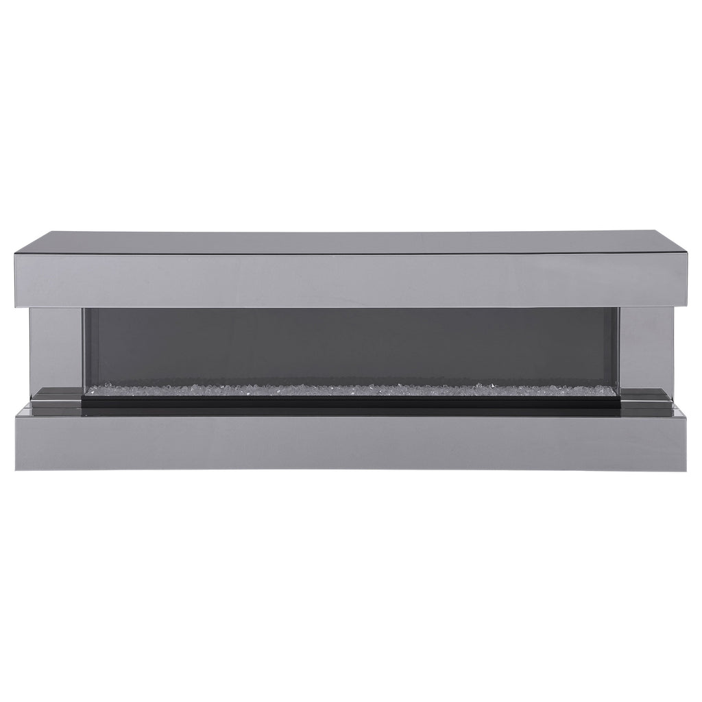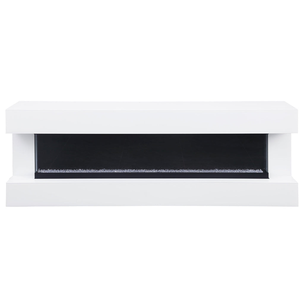This modern TV stand with a visual flame box accommodates televisions up to 72 inches