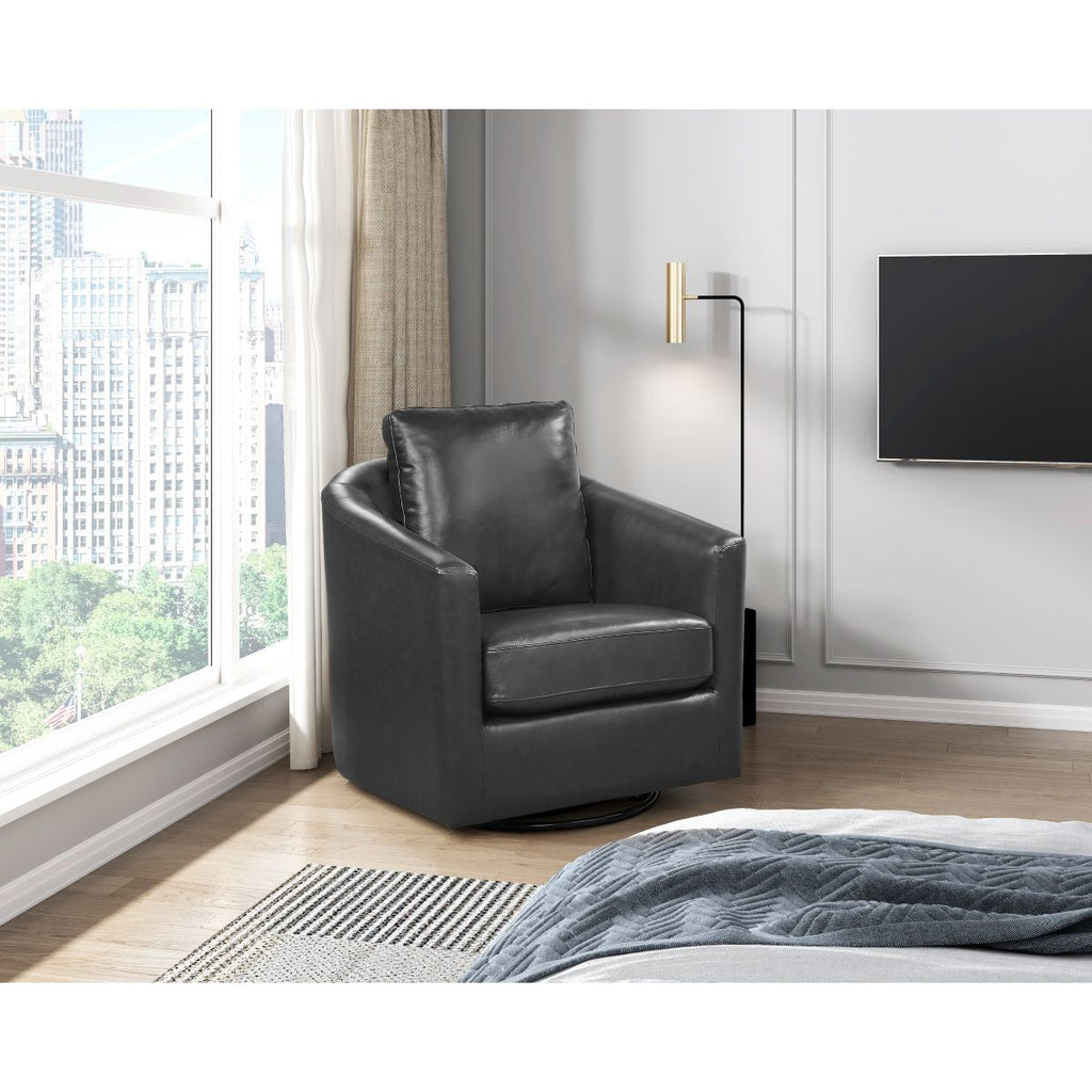 Experience comfort and style with this elegant swivel chair, available in camel, dark brown, or black. It is upholstered in premium top grain leather where your body touches, complemented by high-quality faux leather elsewhere. The leather offers a soft feel that develops rich character over time. A smooth 360-degree swivel provides effortless movement, blending timeless style with modern functionality for any room.