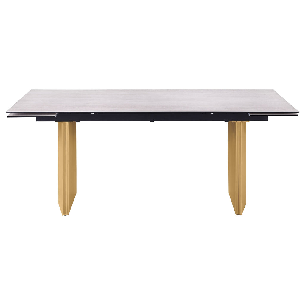This modern dining table showcases a stunning beige glass top with a 3D-printed design, supported by a brushed gold stainless steel base for a sophisticated and luxurious look. Perfect for hosting, the table features two 12-inch refractory extension leaves on each end, seamlessly expanding the seating capacity for larger gatherings. The combination of sleek materials, elegant finishes, and clean lines makes this table a statement piece for contemporary dining spaces, blending beauty and functionality.