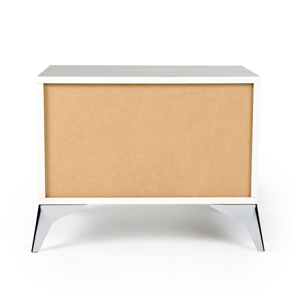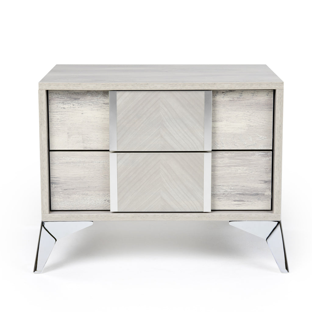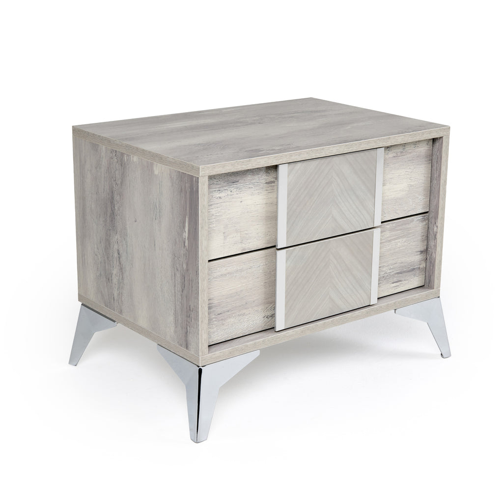 Taking on a rustic look, this light grey colored Nova Domus Alexa Italian Modern Grey Nightstand features a gloss finish. It offers 2 spacious drawers to stow all your bedroom essentials, each of this is adorned with a metal accent that also serves as pulls. Wood markings on the surface made its streamlined look even better. Place a stylish table lamp, an old-fashioned clock, and potpourri to complete your retro modern bedroom.