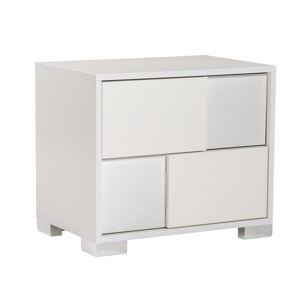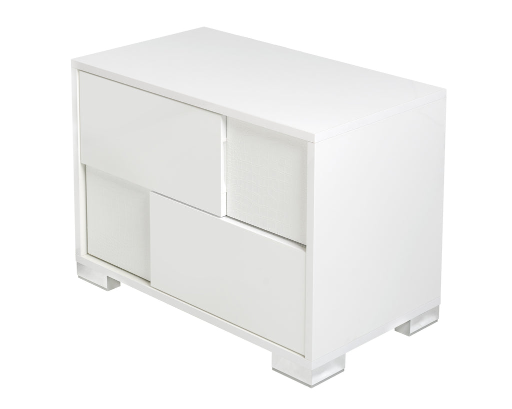 The Modrest Ancona Italian Modern White Nightstand features a sleek white high gloss and crocodile textured finish adorned with silver reflective accents that completed its smart look. This made in Italy modern white nightstand features a 2-drawer design, is fully assembled and has a dimension of W27" x D16" x H21".