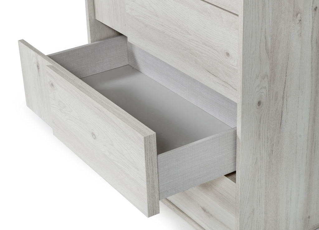 Made in Italy 5-Drawer Chest Drawer Weight Capacity: 22lbs. each Self closing, ball bearing drawer glides White washed oak finish, Matte Built-in handles No Assembly Required
