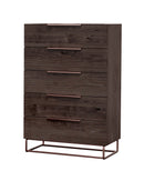 Keep your bedroom spic and span with the Nova Domus Benzon Modern Dark Rovere Chest. Fitted with 5 soft closing drawers, it gives you ample storage for your items. It features a sleek dark matte walnut finish that adds warmth to your bedroom's ambiance. The vertical structure saves on floor space, making it perfect even in a small space like a child's bedroom or a guest room. Stainless steel pulls and legs give a beautiful contrast to the walnut finish of this modern chest.