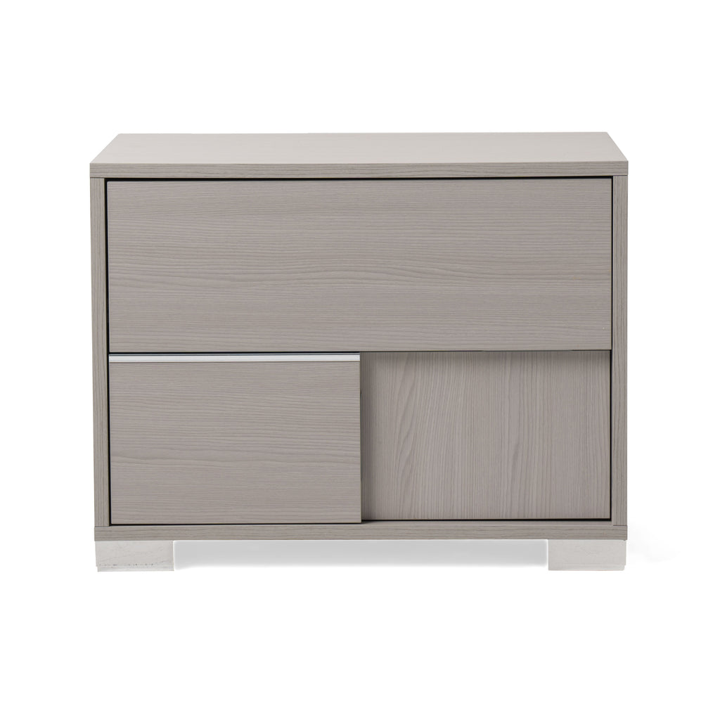 The Ethan Nightstand is a perfect staple piece for your modern contemporary space. The paneled faces overlap across the low-profile frame, creating a dramatic silhouette. Stainless Steel feet finish the base while a grey veneer paneling adorns the faces finish this in a lovely modern way. Pair with the Ethan Bed, Chest, Dresser, and Mirror to complete the set.