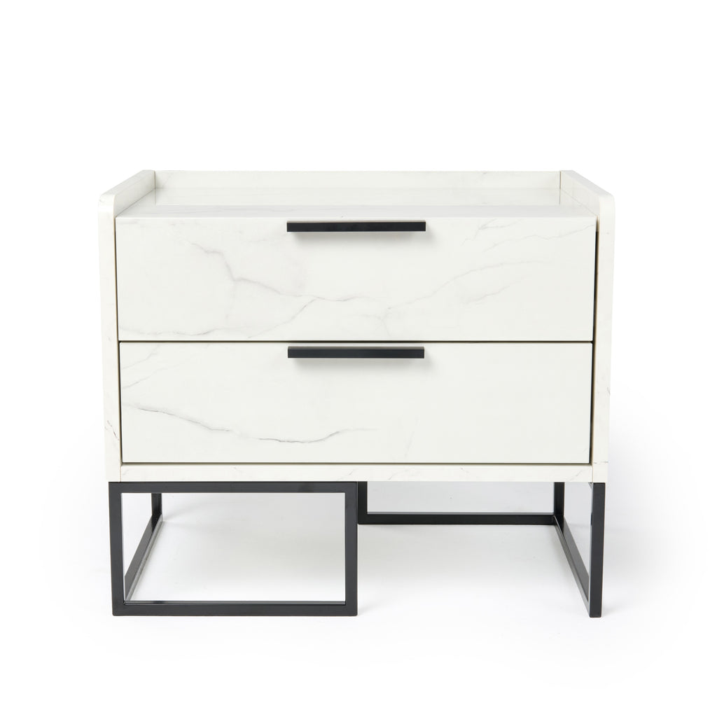 Made in Italy 2-Drawer Nightstand Drawer Weight Capacity: 11lbs. each Self closing, roller drawer glides Faux Marble Finish (White) Matte black metal legs and handles Partial Assembly Required
