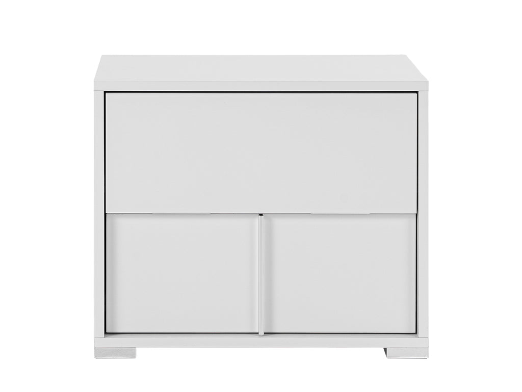 The Modrest Nicla Italian Modern White Nightstand shows fluidity in design featuring a sleek white gloss finish with chrome accents as pulls. It features 2 soft-closing drawers. Fully assembled, this modern nightstand stands on cubed chrome legs and has a dimension of W24" x D16" x H21".