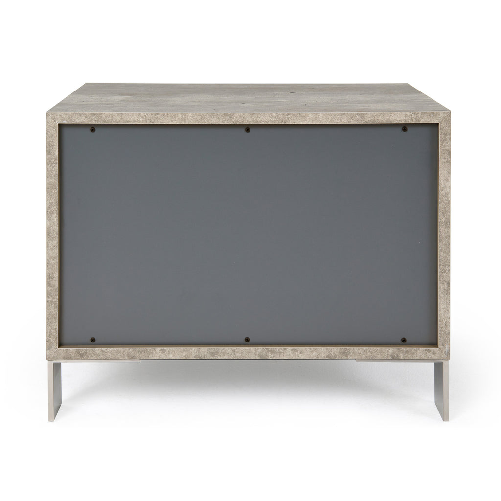 The Nova Domus Conner Modern Dark Walnut & Concrete Nightstand displays a refined appeal featuring a dainty 3/4-inch grey concrete body. It features 2 soft-closing drawers accentuated with brushed stainless steel handles and legs. This modern nightstand has a dimension of W26" x D18" x H20" and requires some assembly.