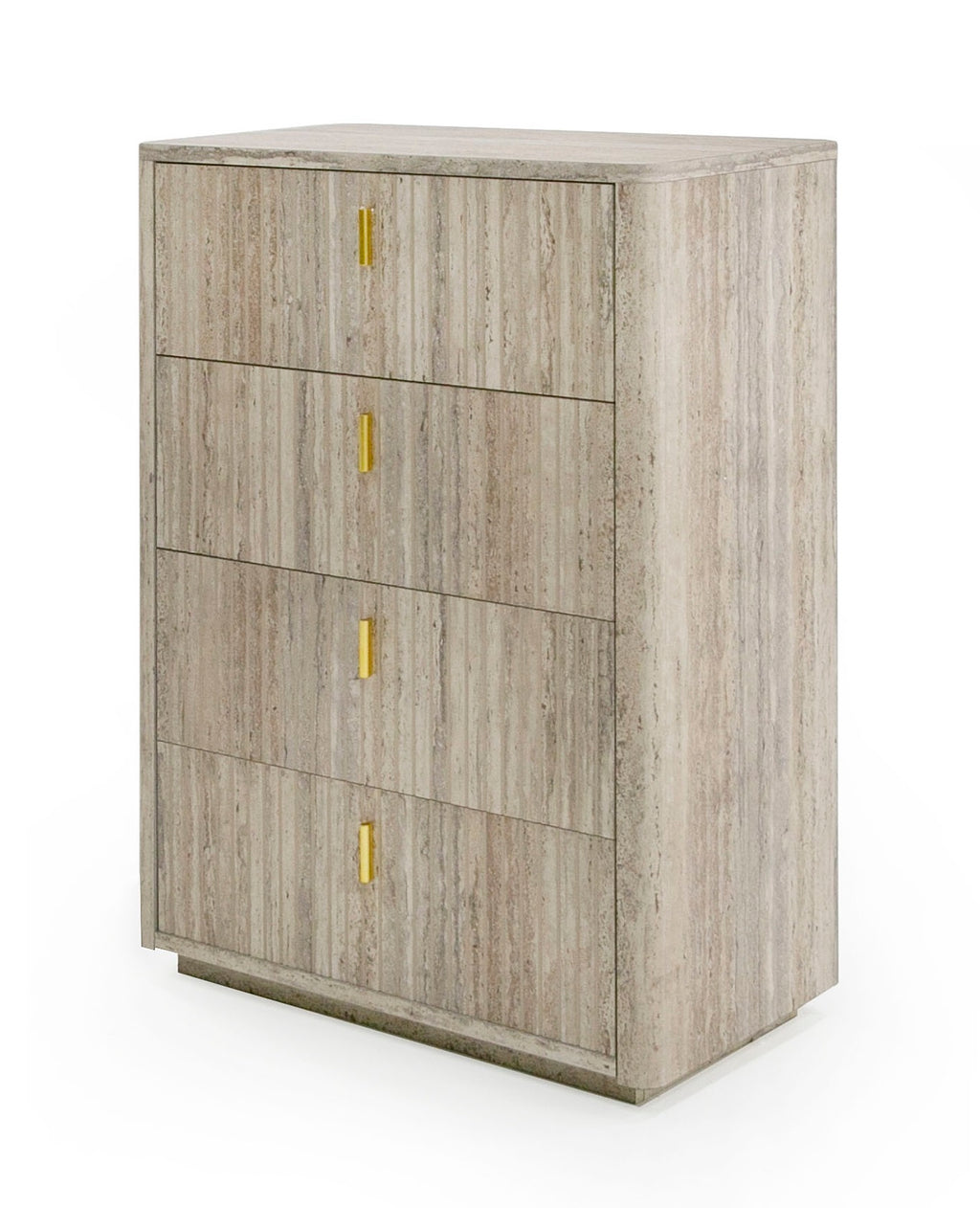 The Roma Chest comes from our new Roma Bedroom collection! This vertical chest features four drawers with soft/self closing drawers and elegant golden metal handles. The surface of the piece is a faux travertine laminate finish all over. The Roma Chest combines excellent quality material and suburb design that makes it a stunner in any bedroom space. The Roma collection also includes a dresser, mirror and nightstand as well as matching living, dining and office furniture!