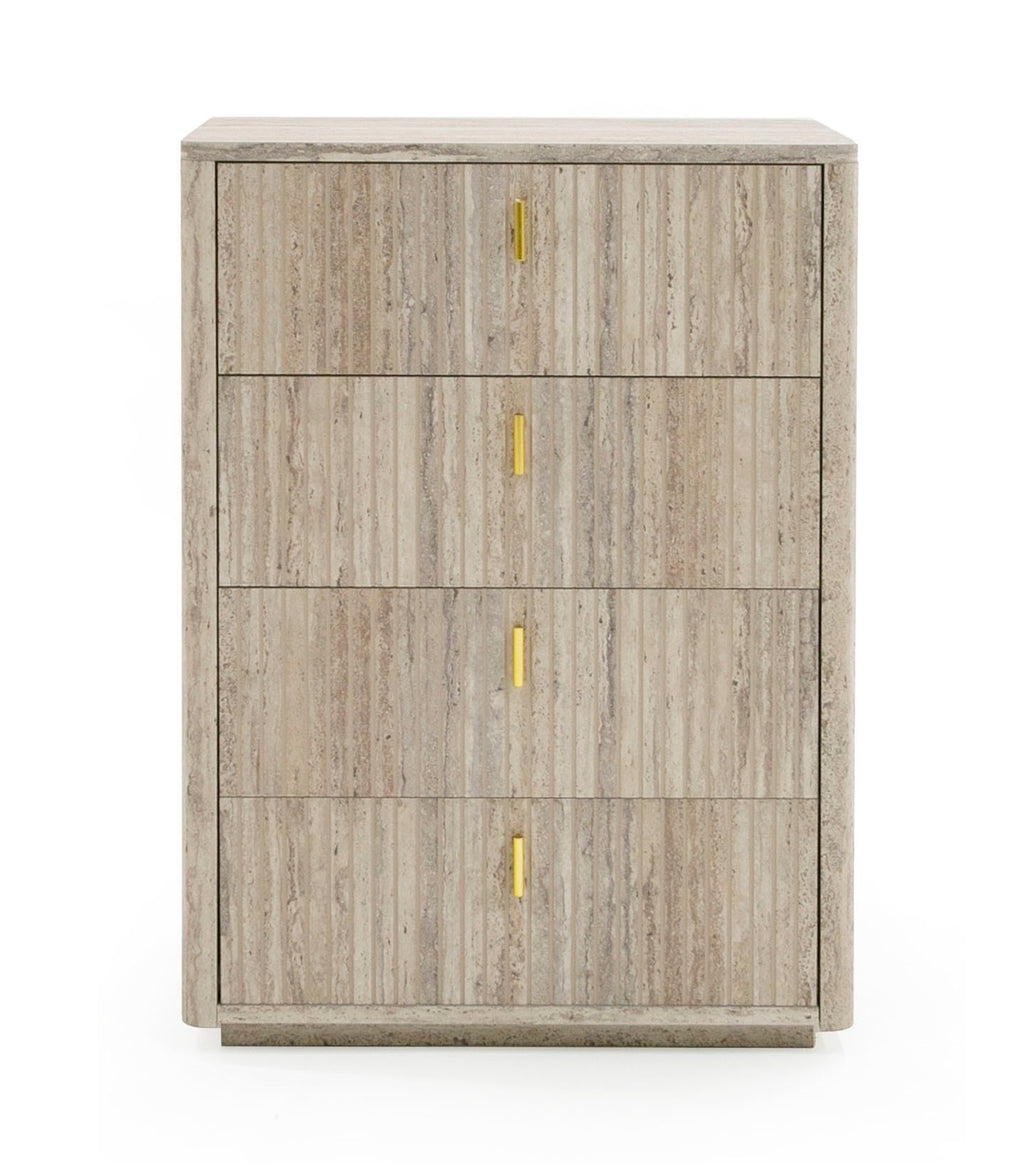 Faux Travertine Textured HPL Laminate Finish Vertical Chest Four Drawers Soft/Self Closing Drawers Ball Bearing Soft Closing Feature Golden Metal Handles Wood Based Frame Tipover Restraint Device Included No Assembly Required