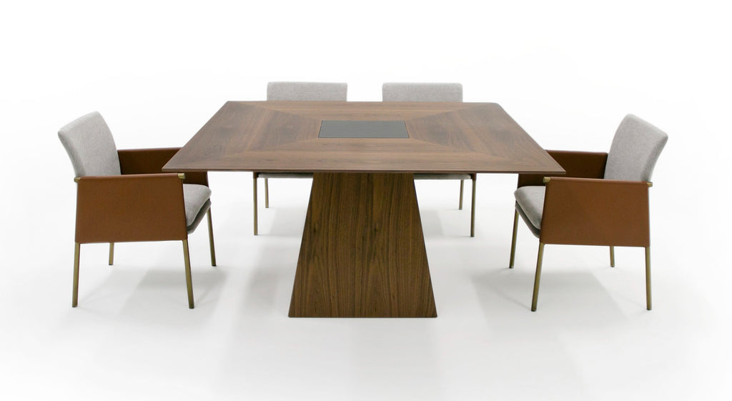 Cora is a Modern Square Dining Table with Pedestal Base in Walnut and Black Tempered Glass. Perfect for dining conversations and smaller dining rooms.