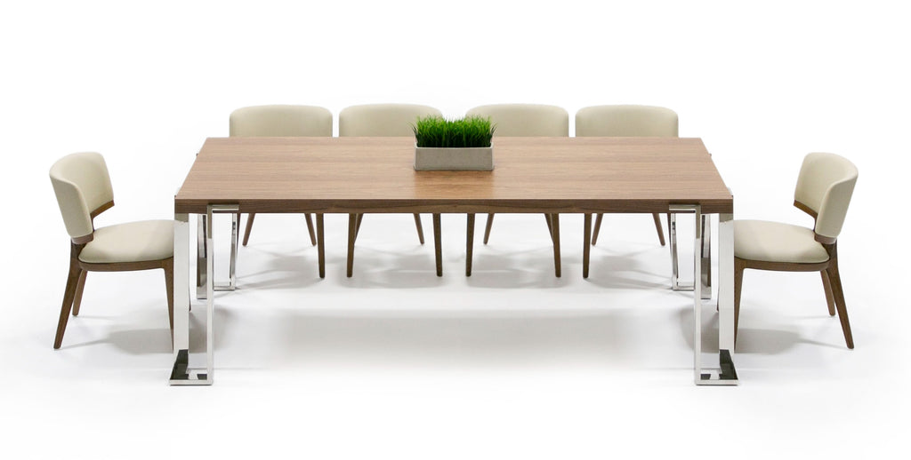 Heloise is our high quality, minimalistic, modern dining/living walnut and stainless steel collection.