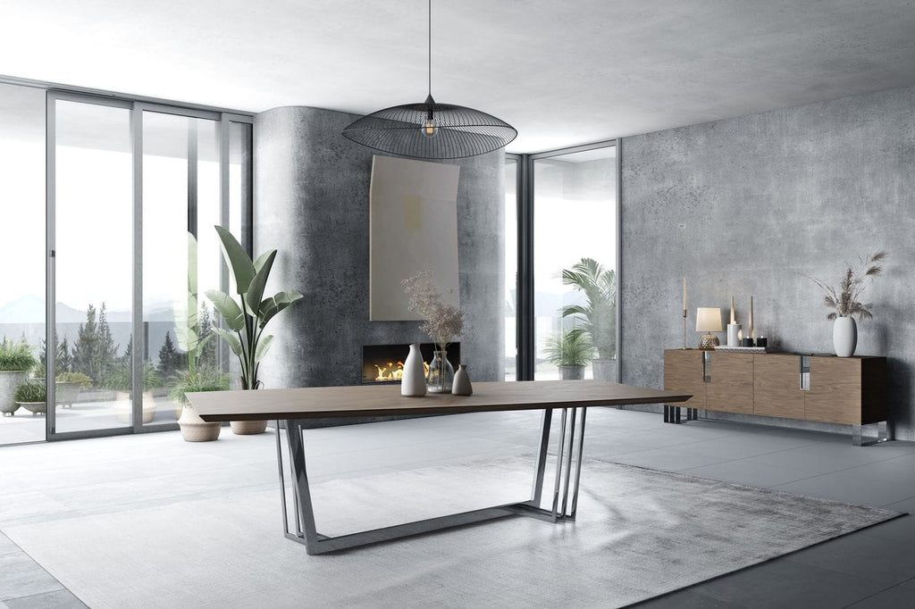 The Gilroy Dining Tables walnut starburst top compliments the Gilroy buffet yet still holds its own. This solid table has a unique stainless steel base with diagonals and a rectangular top.