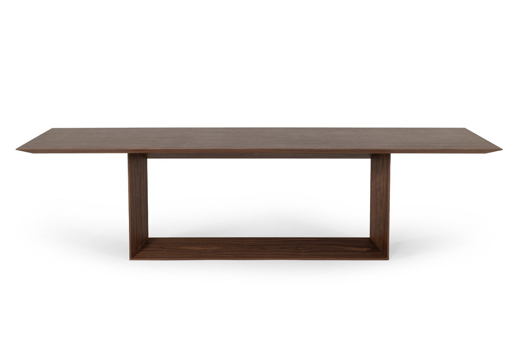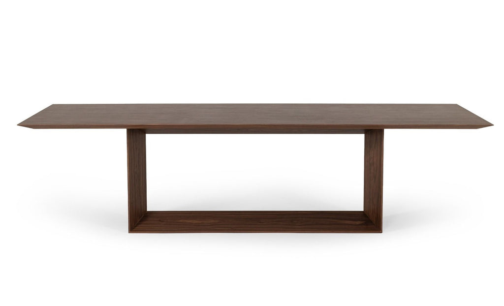 The Channa Walnut Dining Table is a mid-century style table with all the contemporary flare that you are looking for. The beautiful walnut veneer is striking, and the beveled edges create a style that modernizes it. With a u-shaped base, this table would look lovely with white linen chairs for a south beach look or with some leather dining chairs for an industrial style.