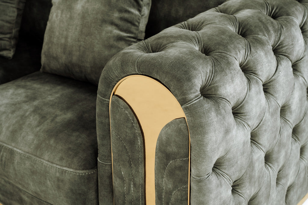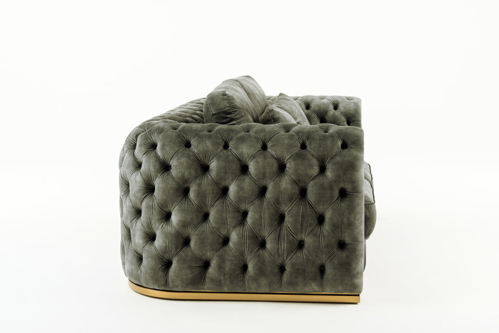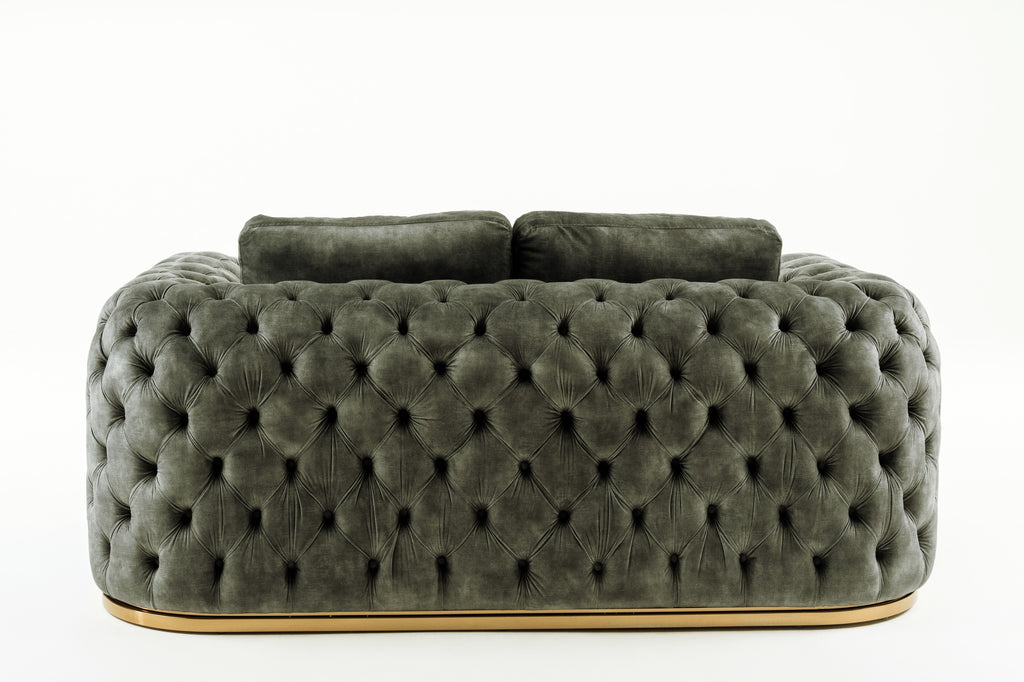 The Divani Casa Dosie Transitional Grey Velvet loveseat is a sophisticated ensemble that combines comfort and elegance. Upholstered in a luxurious grey velvet fabric. The gold stainless steel legs and accents add a touch of opulence, while the button-tufted arms and back provide a classic look. With two throw pillows included, this loveseat is perfect for lounging. The eucalyptus wood frame, foam upholstery fill, and sinuous springs seat construction ensure durability and comfort. Whether for entertaining or relaxation, this loveseat exudes timeless charm and style.