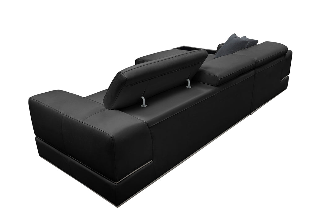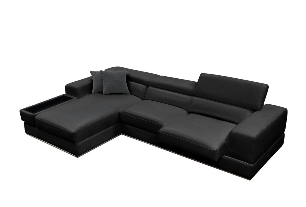 Versatile and modern, the Divani Casa Pella Mini Modern Black Leather Sectional Sofa is stylish and compact enough to fit a small space. It consists of a left facing chaise and a love seat that is adequately wide that promote convenience. It features three adjustable headrests and slide-out cushions providing your ergonomic support, allowing you to relax better while seated or lazing down on the chaise. It is fitted with a dark brown armrest tray beside the chaise where you can put your cup, drinks or snacks while reading a book or watching a movie. Chrome accents lend a striking blend while plastic legs provide sturdy support to this modern sectional sofa.